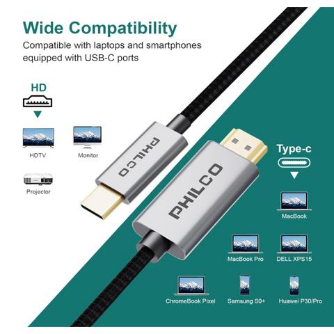 Philco PAH1314C-GY USB-C to HDMI Cable 6ft, 4K, 60Hz MacBook/iPad Compatible (Black)