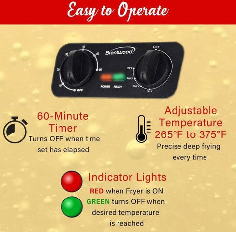 The Brentwood DF730S Deep Fryer 12 Cup delivers crisp, delicious results with a large oil capacity and easy-to-use temperature controls. Designed for family meals and batch cooking, it heats quickly and maintains consistent frying temperatures for fries, chicken, seafood, and more. Its removable basket, viewing window, and compact design make it a convenient and reliable addition to any kitchen.