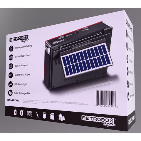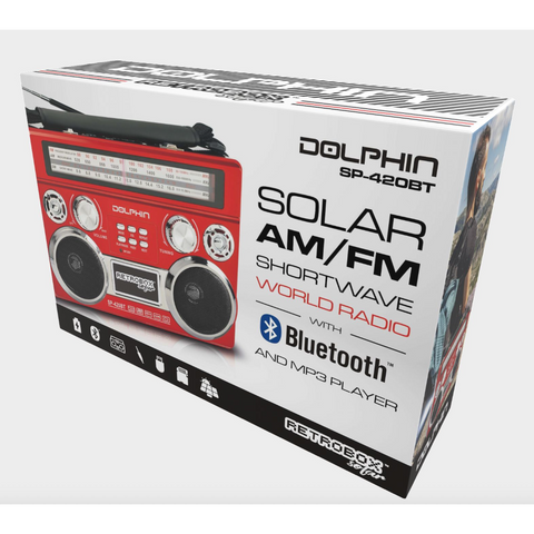 The Dolphin SP420BTRD Retrobox offers vintage style with modern audio performance in a solar rechargeable Bluetooth speaker. Featuring a built-in AM/FM radio, USB and SD card inputs, and a solar panel for eco-friendly charging, this speaker is perfect for both indoor and outdoor use. Its bold red finish and compact design make it as stylish as it is portable.