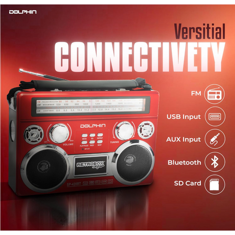 The Dolphin SP420BTRD Retrobox delivers rich sound and nostalgic charm—making it your perfect companion for music anytime, anywhere.