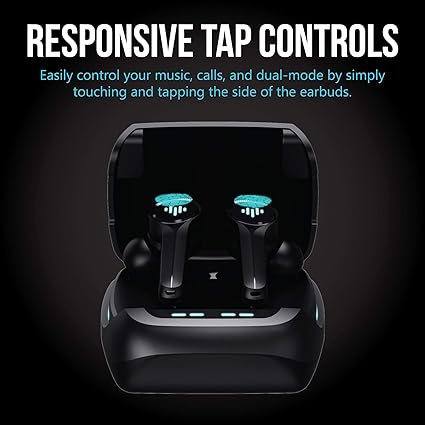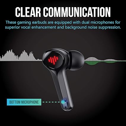 Design: Sleek black earbuds with a modern gaming look