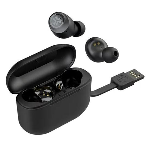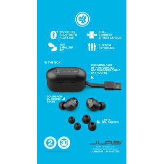 • INCLUDES: GO Air POP True Wireless Earbuds, Charging Case w/ Integrated USB Charging Cable, 3 Sets Gel Tips: Small, Medium, Large, JLab Two Year Warranty.