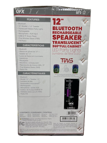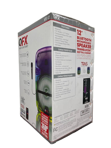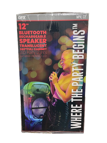 The QFX MPX12 Translucent Bluetooth Speaker 12 inch combines clear, powerful sound with a unique translucent design and LED light effects. With wireless streaming, multiple inputs, and portability, it's built to elevate your music anywhere you go.