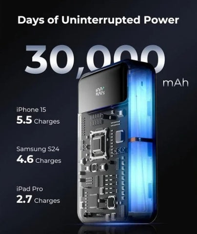 • 30000mAh high capacity – Provides multiple full charges for phones, tablets, and other USB-powered devices