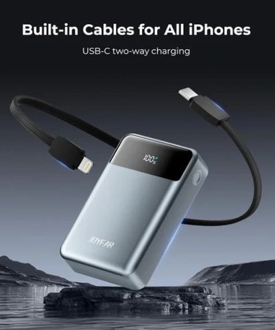 The JoyFar JFPB02 Portable Charger Power Bank 30000mAh Built-in Cable USB-C Lightning offers massive backup power with versatile charging options thanks to its built-in USB-C and Lightning cables. Designed for heavy-duty use, it charges smartphones, tablets, and accessories reliably whether you're at home, commuting, or traveling. Its large capacity and integrated cable design make it a convenient all-in-one solution for power on the go.