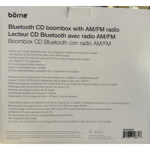 The Borne PRCD685B is a versatile and portable boombox designed to deliver high-quality audio entertainment. Equipped with a top-loading CD player, AM/FM radio tuner, Bluetooth connectivity, and an auxiliary input, this boombox caters to various listening preferences. Its compact design, built-in handle, and telescopic antenna ensure easy portability, making it ideal for use at home, in the backyard, or on the go.